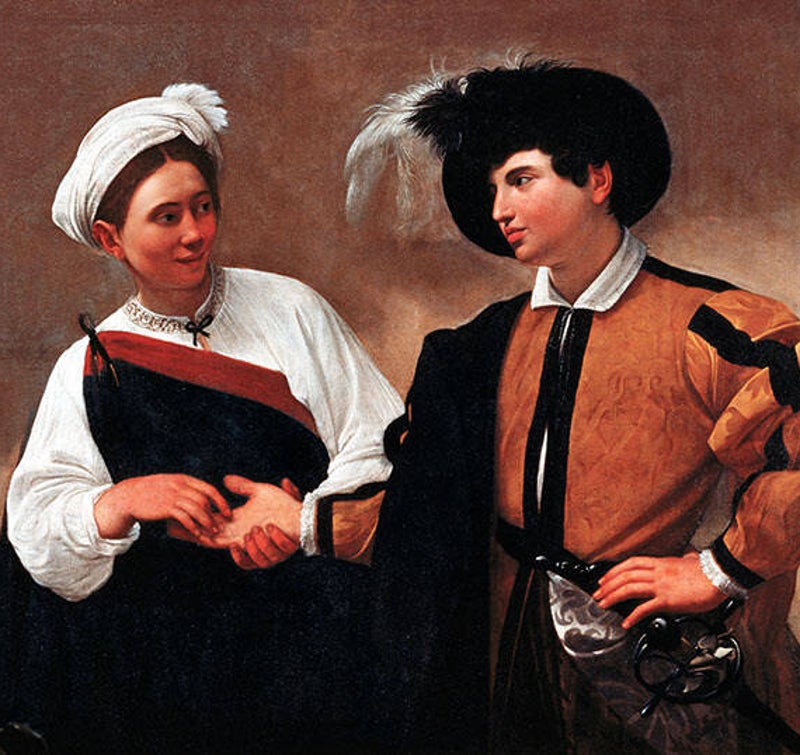 В первой работе интересна игра взглядов, которую художник создает между двумя фигурами: цыганка, делая вид, что гадает по руке наивного молодого человека из богатого сословия, ловким жестом снимает кольцо с его пальца.